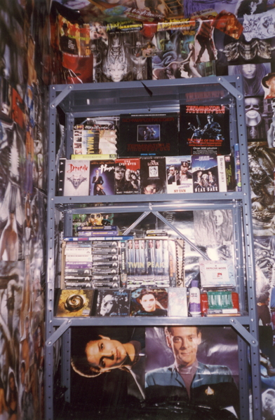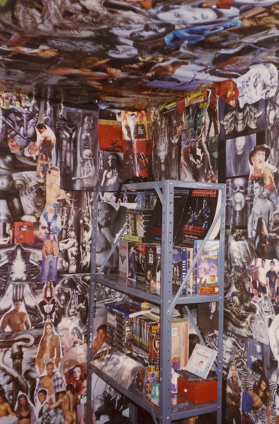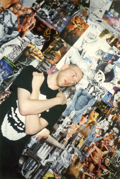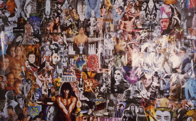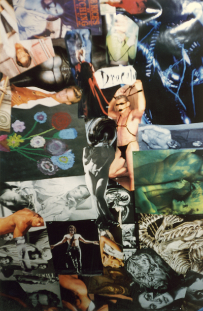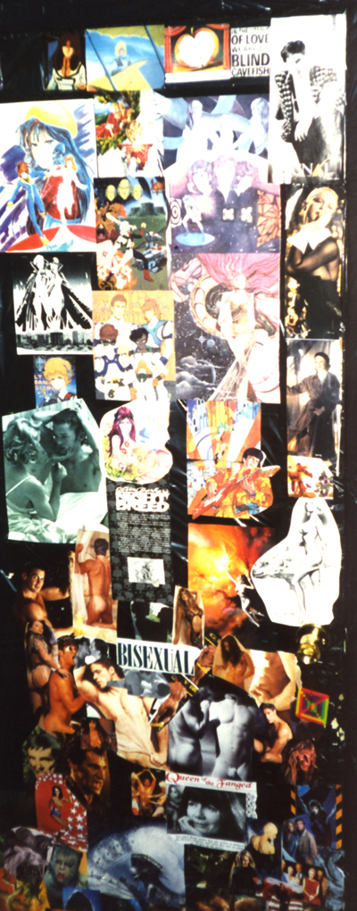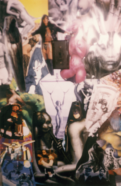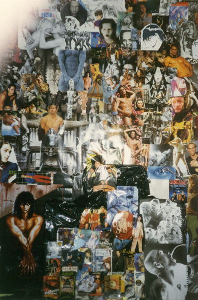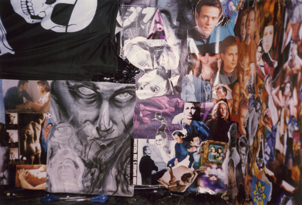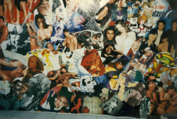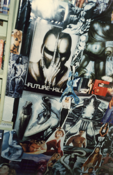 I was raised in an old farmhouse in Milan, Michigan. I started working on a collage in my bedroom in late 1992, early 1993. Around that time I was meant to have graduated from High School but I didn't. I was always on the verge of suicide. I hated my life and my living conditions. Being gay in a Baptist household was bad enough, but our home was dirty, insect & pet infested, dusty, numbingly cold in winter and disturbingly hot in the summer. It just wasn't a great place to live. I rebelled and used the collage I created to distract myself and cope with all that I couldn't control in my surroundings. I don't know what inspired me to begin with, but I used a staple gun and black trash bags to cover the walls and ceiling, then started putting up pictures. I was a big fan of Giger, so I started with his artwork and then built on that. The photos I have of my room then are old and many of them are only fragments; others I can't find. But this is what I've been able to piece together. I continued with this collage until leaving home in January of 1997. Without warning me, most of the pictures that were collected and used for this collage at considerable personal cost, were ripped from the room that hosted them and burnt to cinders by my family. This hurt me deeply, but didn't prevent me from dreaming of a new collage, which failed to materialize until almost a decade later.
