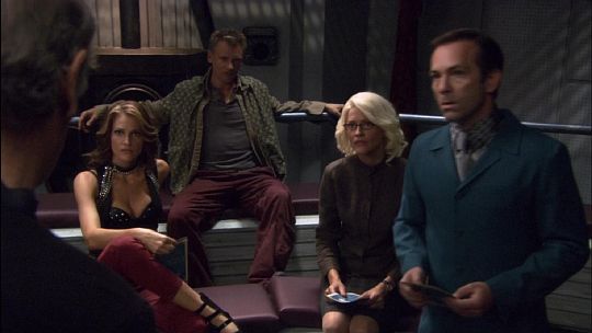 From a Coming Soon Dot Net Review of the DVD: "The real star of the movie is Dean Stockwell as Brother Cavil. We see him and his copies inserted into numerous scenes from the original series. We see him on Caprica infiltrating Anders' resistance. We see him on Galactica conspiring with the various Six models. We see him in several locations with the Final Five during the Initial Cylon attack. The end result is a film that feels more like a lot of deleted scenes spliced together into a 2 hour film rather than a new story. It is also completely inaccessible to anyone other than those that watched the series. That being said, they do add a couple of new storylines. We meet a new Six model who is a brunette prostitute. We're also re-introduced to Lymari Nadal as Giana. She was in one episode of the series, but plays a major role in this film. We discover that somewhere along the way, she married Simon, one of the Cylon human models. Simon falls for Giana and her daughter and eventually comes to the conclusion that wiping out the humans is wrong. In fact, the main crisis that Cavil seems to have is all the Cylons on Galactica becoming sympathetic towards the humans. He's definitely portrayed as the devil behind the scenes as he has to re-convince them of their mission. Cavil has an especially evil scene that is one of the most poignant scenes of the film."
