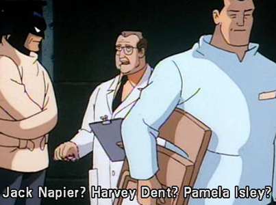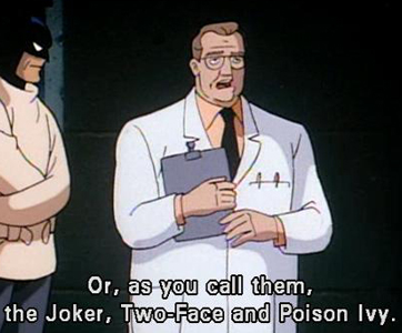 Two-Face, Ivy & Joker (who appear as hallucinations here) are said to be in Arkham; a nice bit of continuity with the previous 2 episodes.