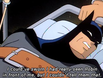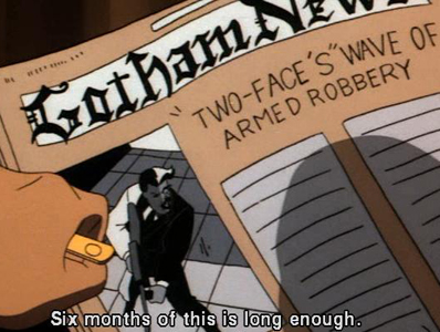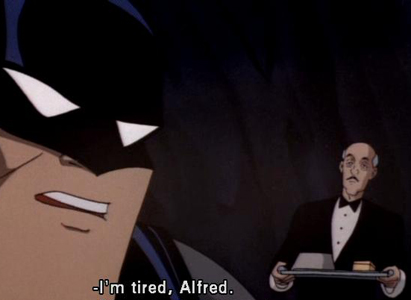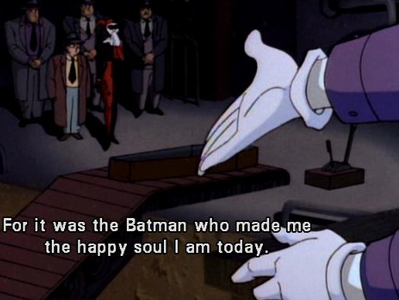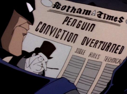 The episode begins with Batman reading that Penguin's recent conviction has been overturned (see previous episode) and Batman saying that he's tired: