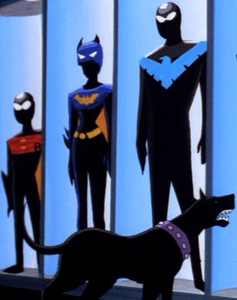 Terry McGinnis / Batman, older Bruce, his futuristic Gotham City & his faithful dog Ace are reintroduced here after first appearing in the Static Shock episode "Future Shock", and returning in the alternate futures of the JLU episodes "The Once and Future Thing, Part I: Weird Western Tales" & "The Once and Future Thing, Part II: Time Warped".