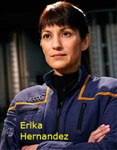 This episode also introduces Captain Erika Hernandez, who is the Captain of the new NX-02, the Columbia, which was mentioned last season. Erika mentions that while Archer was away one of the movies that was released was "Another World War III epic. It swept all the awards.". World War III has been mentioned several times in Trek but never actually depicted. In the Classic Trek episode "A Piece Of The Action" it was mentioned that the death toll for World War III was 37 million; in "Star Trek: First Contact" however the death toll was stated to be 600 million, though it's possible that the Next Gen crew had access to info that had not been revealed to Kirk's crew. Captain Hernandez & the Columbia return later in the season (091 "Affliction").