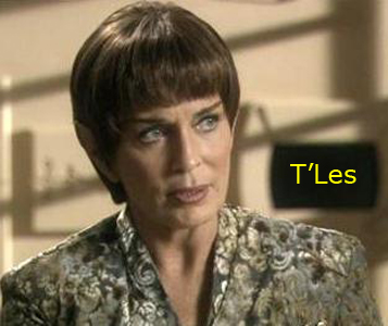 T'Pol's mother, T'Les is introduced here. She reveals here that she chose to retire from the Vulcan Science Academy rather than face dismissal. She was under investigation by the Security Ministry, who claimed that she had taken restricted date from the Academy archives. T'Les explains that the Security Ministry's accusations were fabricated as a kind of retaliation towards T'Pol for her involvement in the mission that led to the destruction of the Vulcan's P'Jem Monastery (007 "The Andorian Incident") ; when T'Pol wasn't within their grasp, they struck out at her mother. They told T'Les that the inquiry would end if she chose to resign. T'Les returns later this season (084 "Awaking").